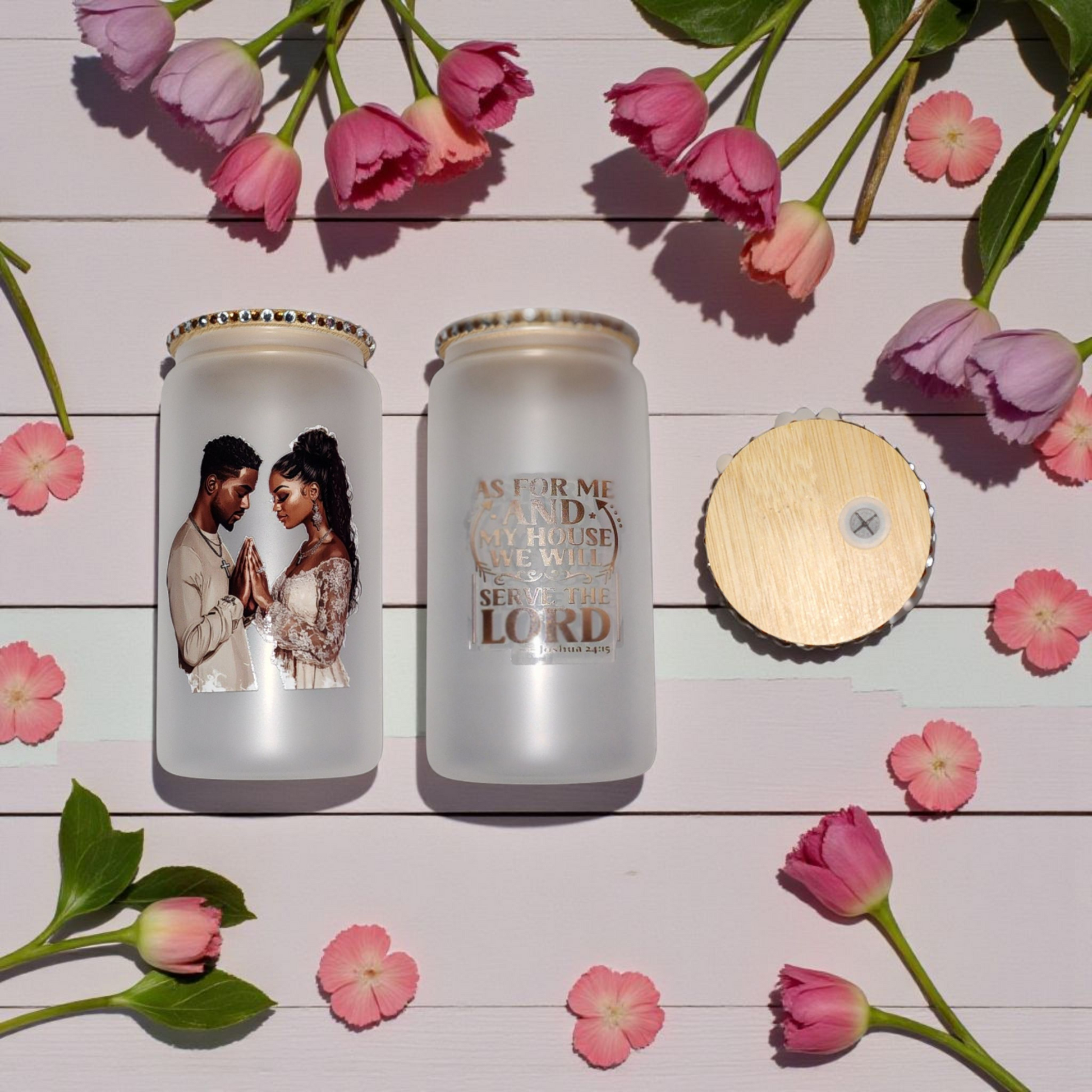 Frosted 16 oz Glass Can Tumbler with Bamboo Rhinestone Trim Lid