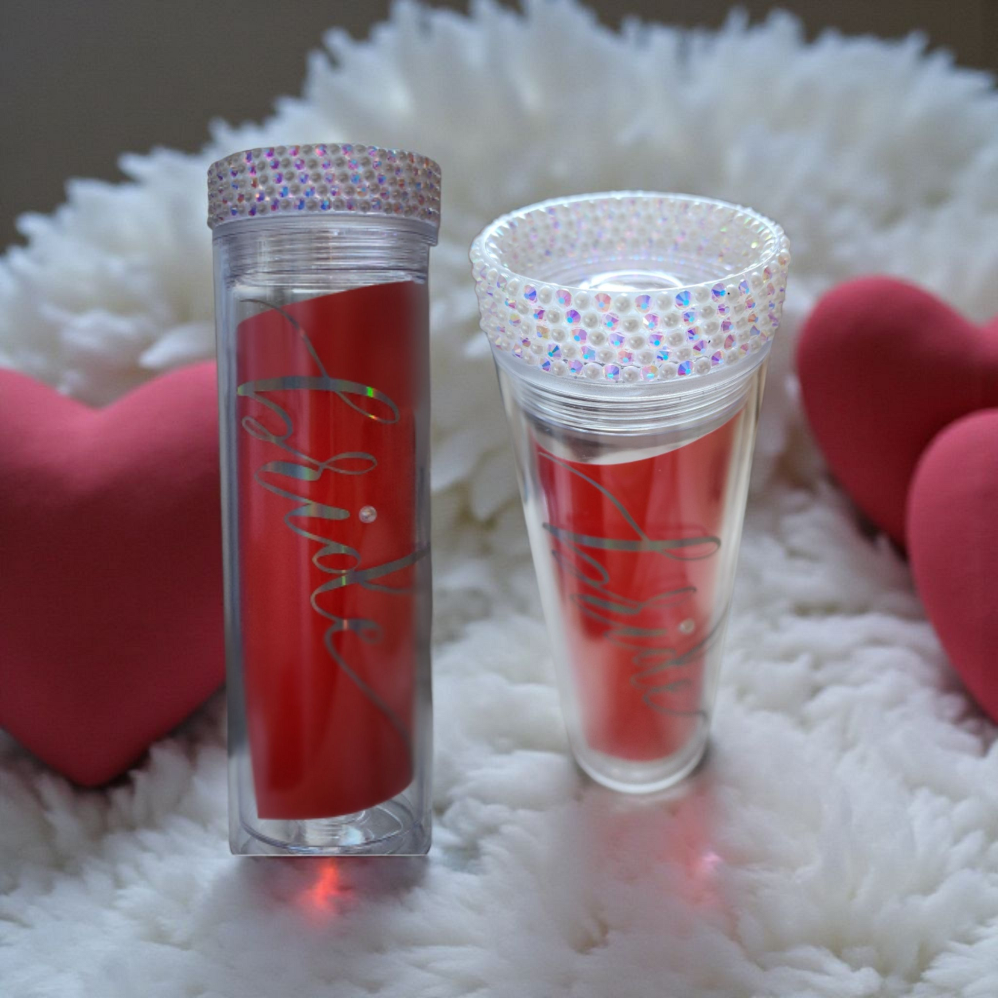 Clear Acrylic Skinny Tumbler with silver bride in cursive with white pearl stones on lid. The red inside the cup is just for presentation.