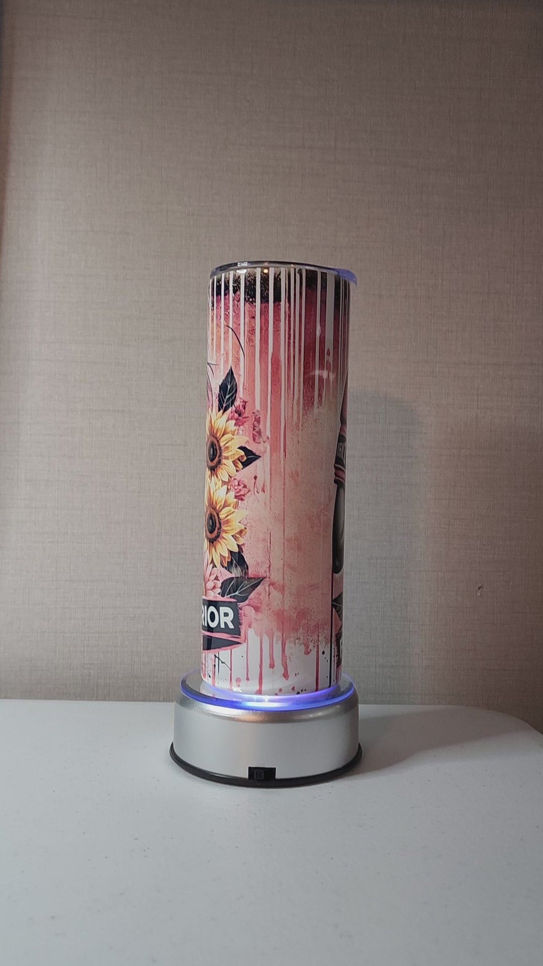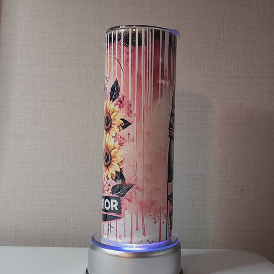20 oz Stainless Steel Tumbler. Find straw toppers here: https://artisanry.net/products/breast-cancer-straw-topper