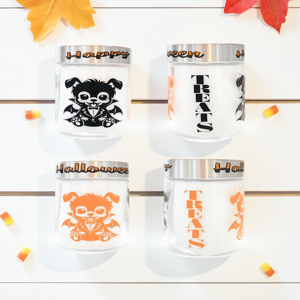 Glass Jar with vampire dog on both sides (1 in orange and 1 in black), word treats on other 2 sides, and orange top.