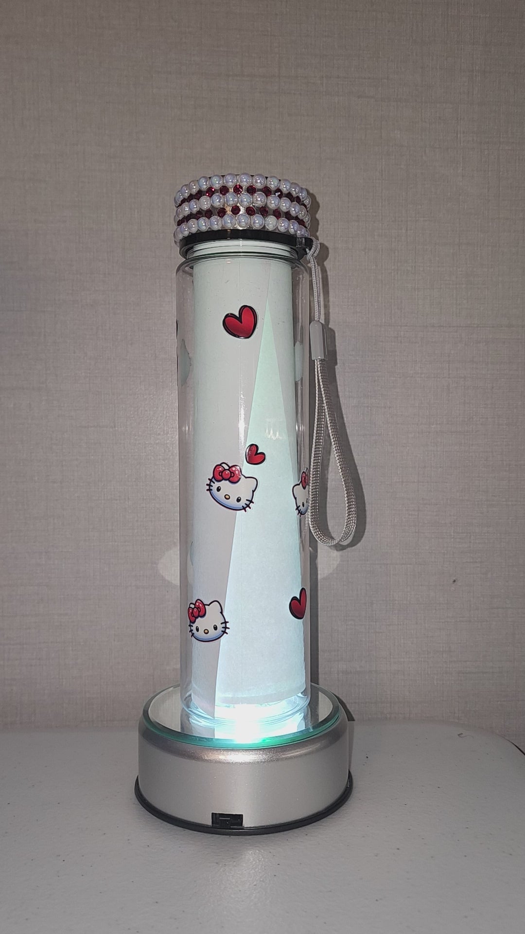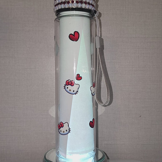 Clear 18 oz Acrylic Water Bottle with Strap on Screw Off Lid. Kitty theme design all around water bottle. White pearls and red rhinestones around lid.
