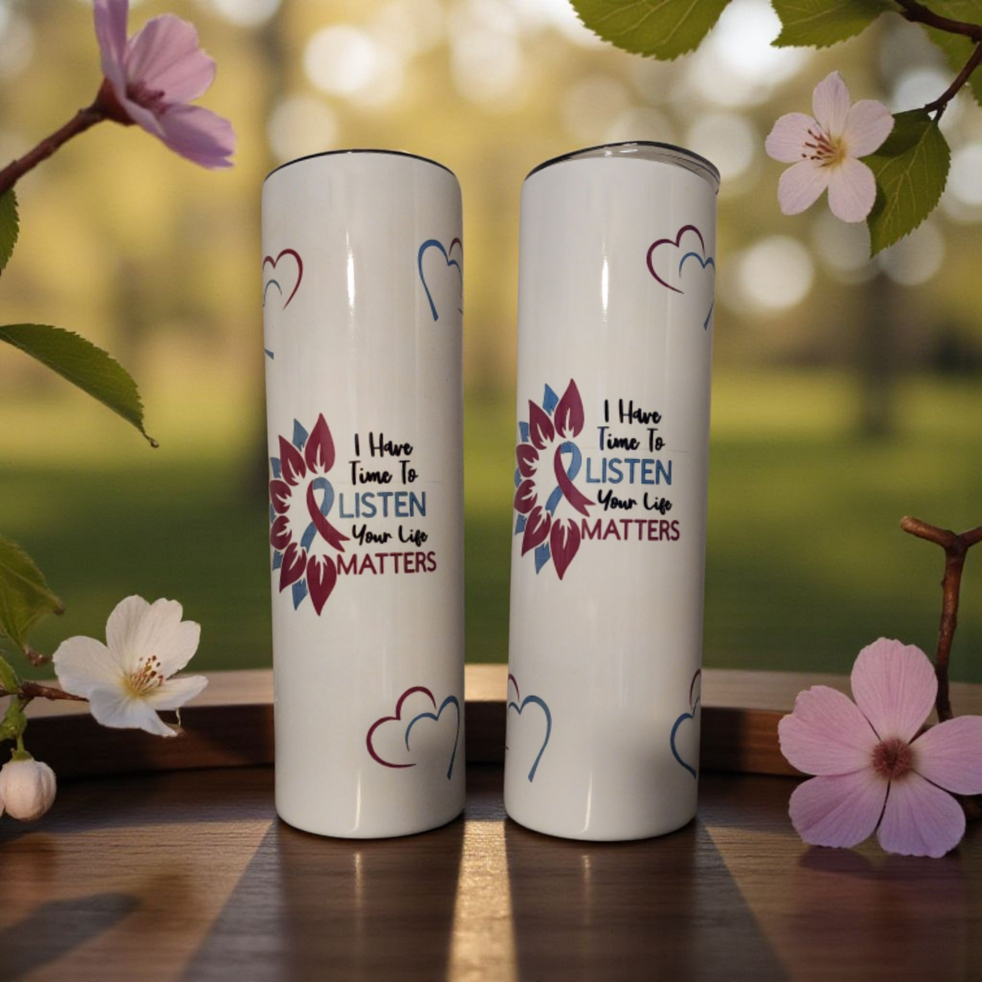 30 oz Stainless Steel Tumbler with Quote "I Have Time to LISTEN. Your Life MATTERS" on both sides with decorative open hearts